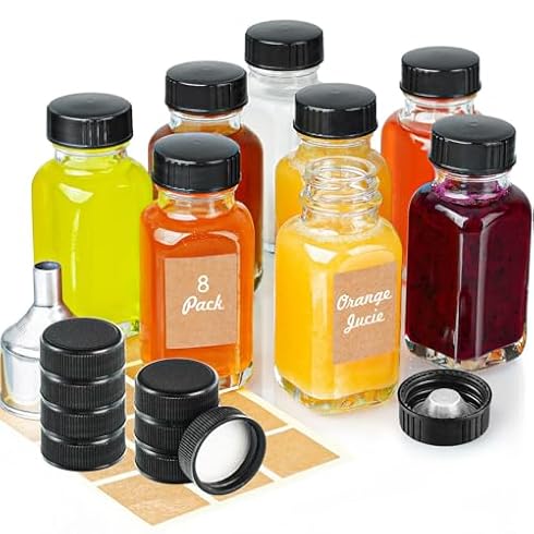 Syntic Clear Reusable Ginger Shot Bottles with Caps - 8 Pack 2 oz Small Square Glass Jars with 8 Sealed Conical Inner Caps & 8 Airtight Lids, Wide Mouth Juice bottles for Fridge, Extra Sticker, Funnel